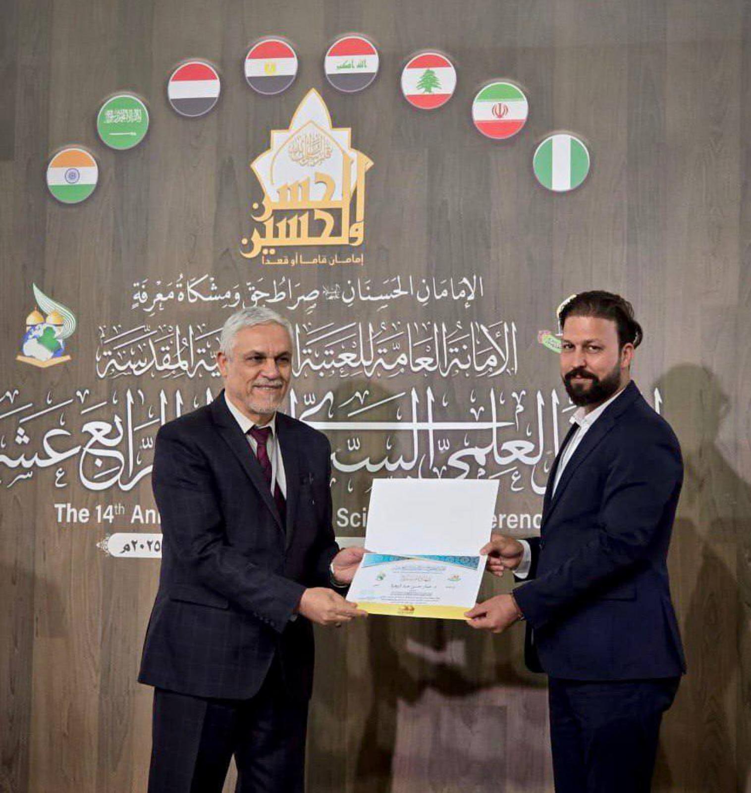 حسن عبد الزهرة"، بمنحه شهادة تقديريَّة؛ تثمينًا لمشاركته العلميَّة