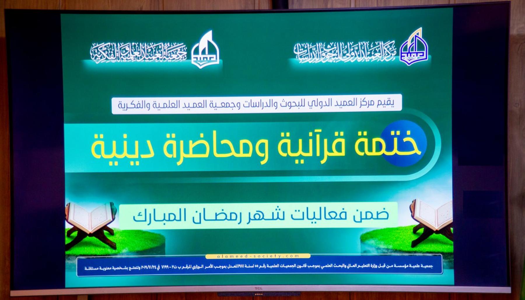 نظَّمت جمعيَّة العميد العلميَّة والفكريَّة ومركز العميد الدَّولي للبحوث والدراسات محاضرةً دينيَّةً وختمةً قرآنيَّةً ضمن فعاليَّات شهر رمضان المبارك، بمشاركة ملاك الجمعيَّة والمركز، وستستمر هذه الفعاليَّة طيلة أيَّام الشهر الفضيل.