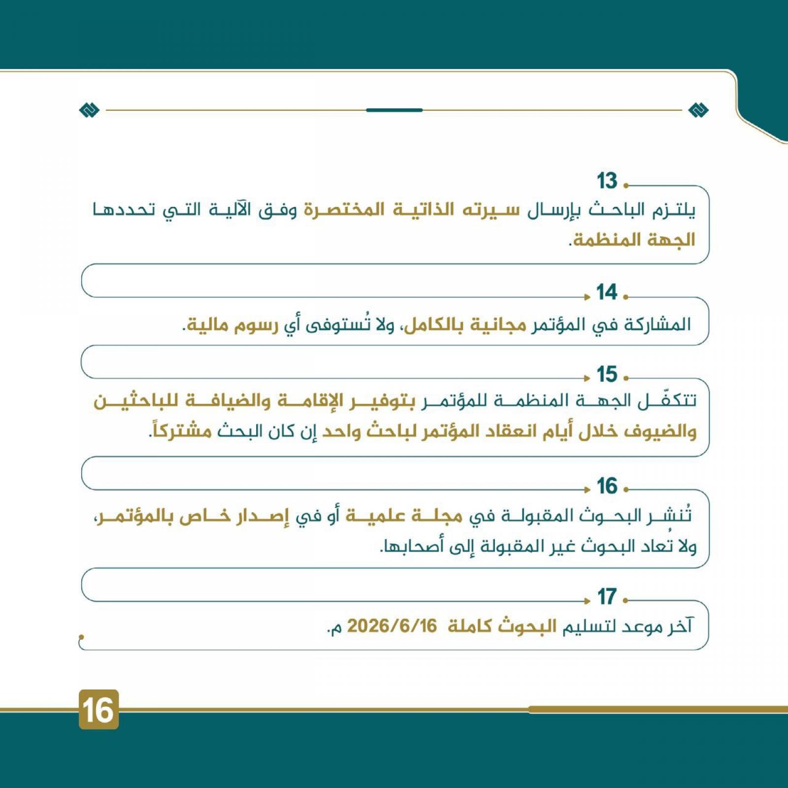16- تُنشر البحوث المقبولة في مجلَّة علميَّة أو في إصدار خاص بالمؤتمر، ولا تُعاد البحوث غير المقبولة إلى أصحابها.