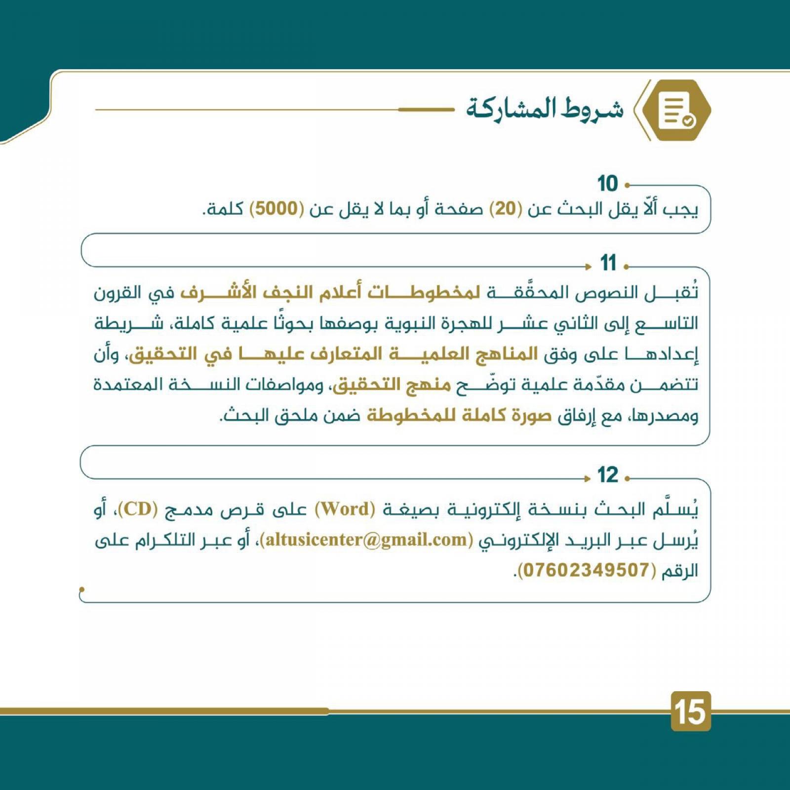 11- تُقبل النُّصوص المحقَّقة لمخطوطات أعلام النجف الأشرف في القرون التاسع إلى الثاني عشر للهجرة النبويَّة بوصفها بحوثًا علميَّة كاملة، شريطة إعدادها على وفق المناهج العلميَّة المتعارف عليها في التحقيق، وأن تتضمَّن مقدِّمة علميَّة توضِّح منهج التحقيق، ومواصفات النسخة المعتمدة ومصدرها، مع إرفاق صورة كاملة للمخطوطات ضمن ملحق البحث.