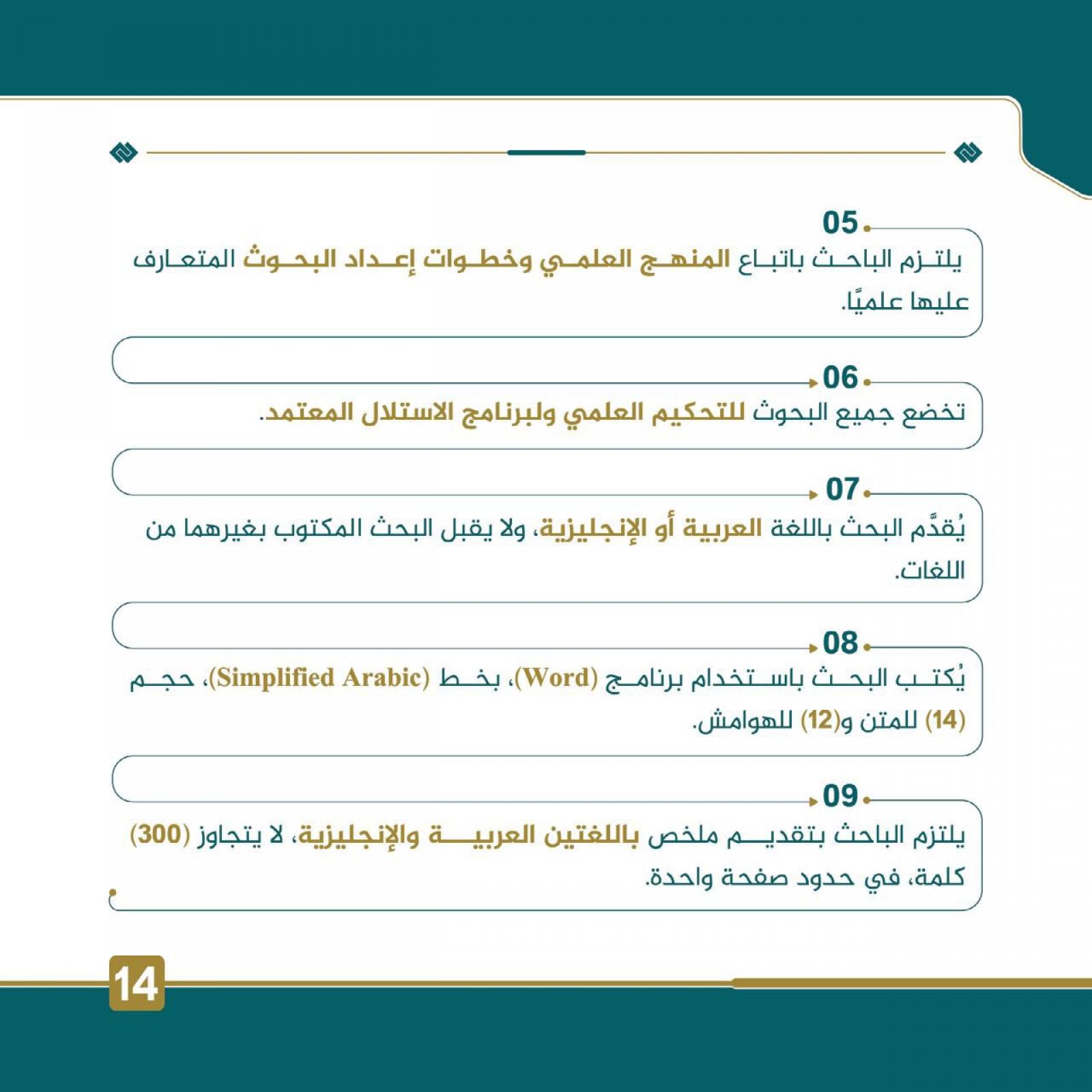 8- يُكتب البحث باستخدام برنامج (Word)، وبخط (Simplified Arabic)، حجم (14) للمتن و(12) للهوامش.
