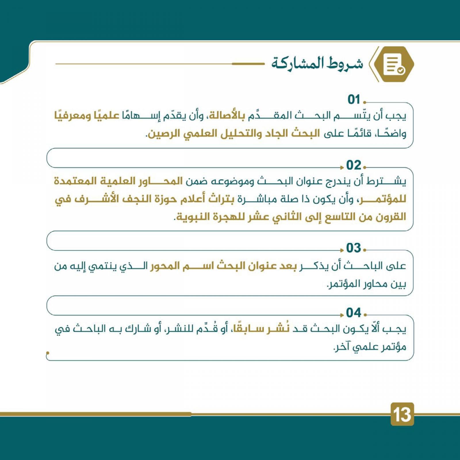 13- يلتزم الباحث بإرسال سيرته الذاتيَّة المختصرة على وفق الآليَّة التي تحدِّدها الجهة المنظِّمة.