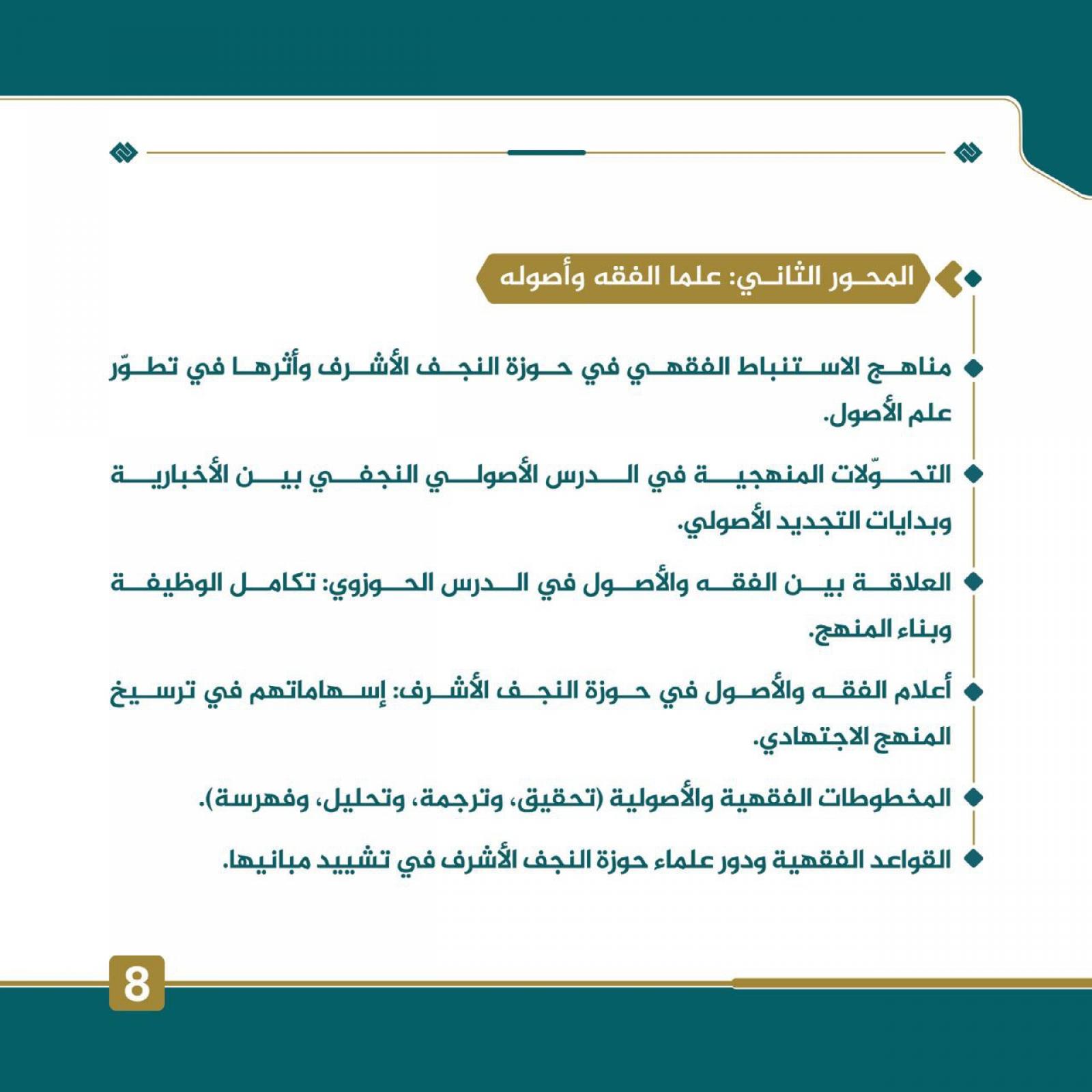 2- يشترط أن يندرج عنوان البحث وموضوعه ضمن المحاور العلميَّة المعتمدة للمؤتمر، وأن يكون ذا صلة مباشرة بتُراث أعلام حوزة النَّجف الأشرف في القرون من التاسع إلى الثاني عشر للهجرة النبويَّة.