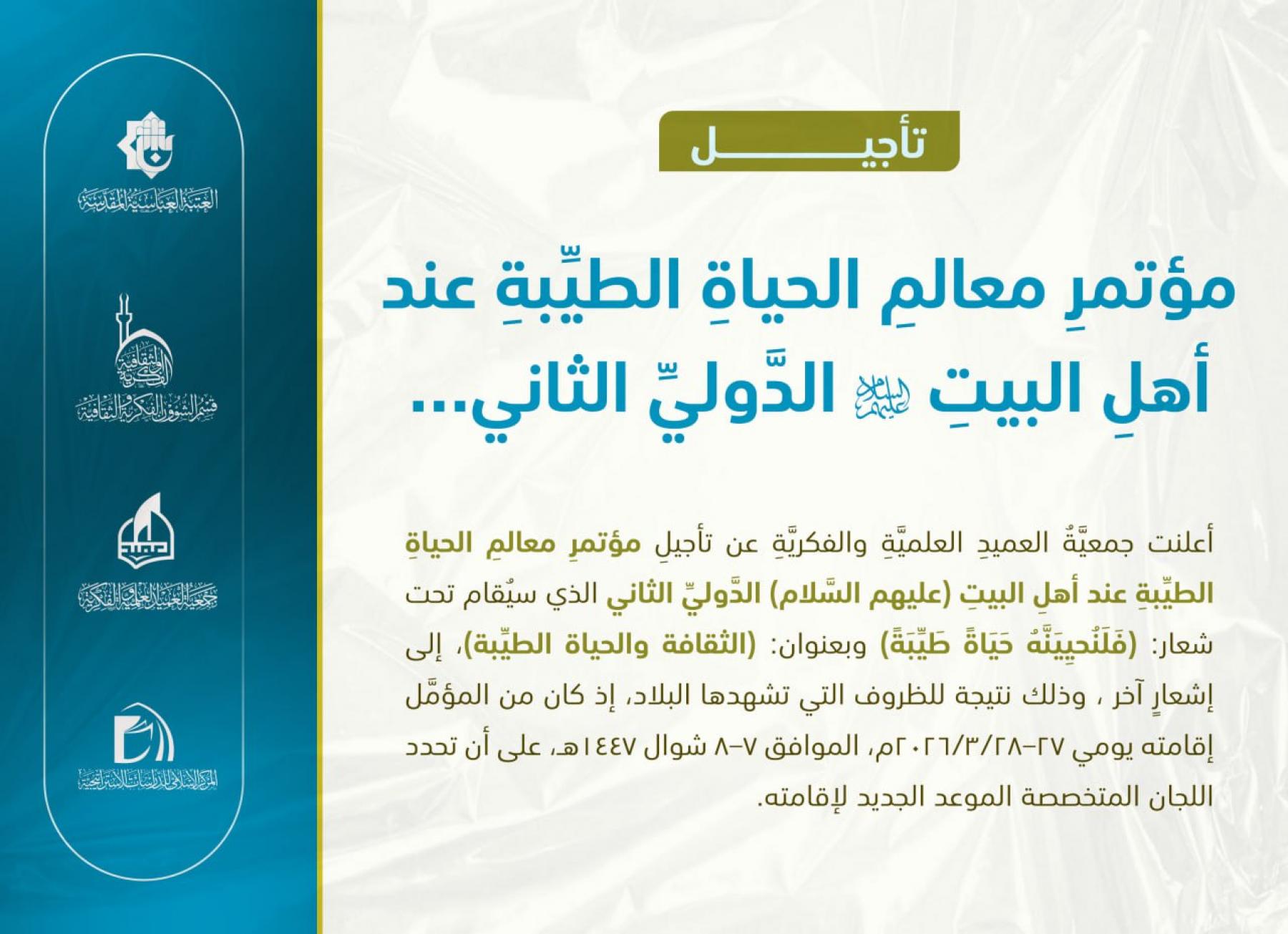 تأجيلُ مؤتمرِ معالمِ الحياةِ الطيِّبةِ عند أهلِ البيتِ (عليهم السَّلام) الدَّوليِّ الثاني...