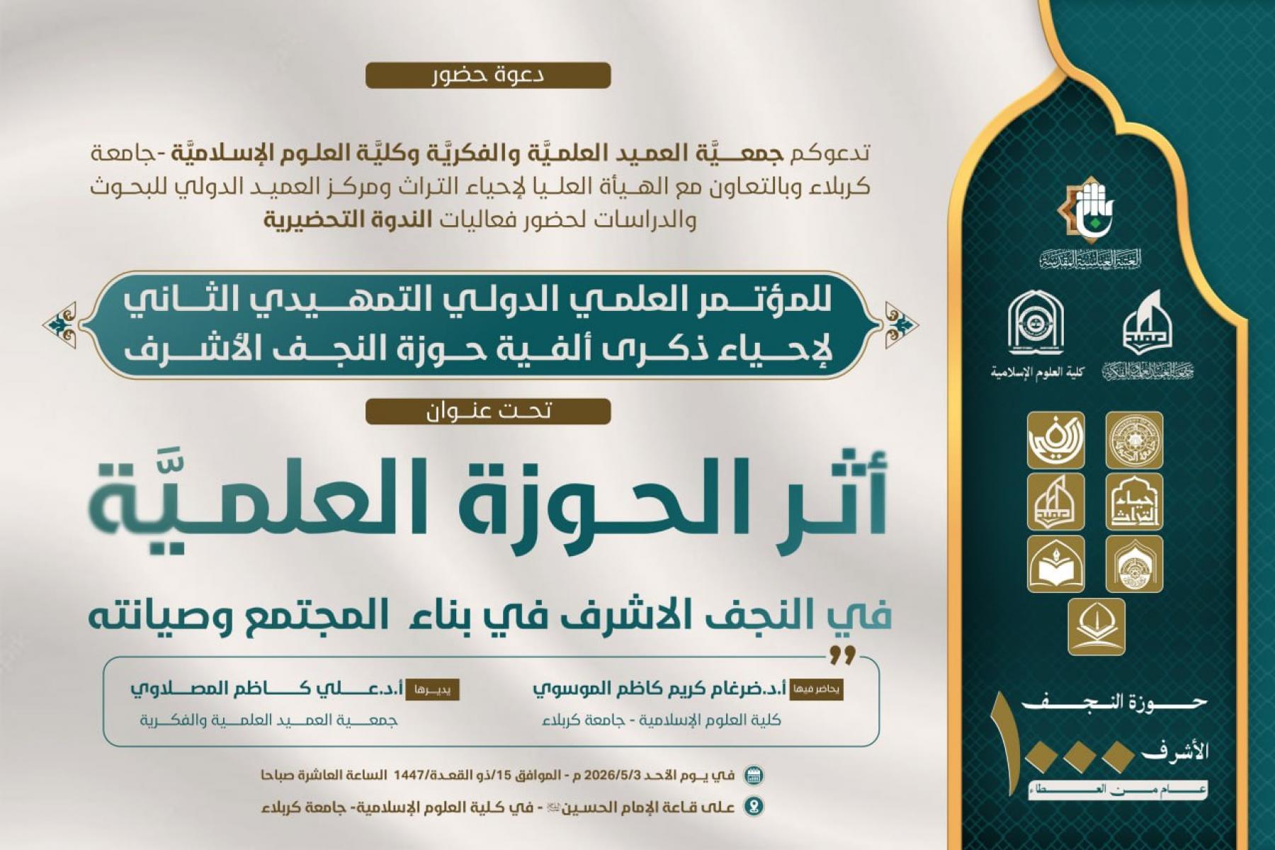 تدعو جمعيَّة العميد العلميَّة والفكريَّة وكليَّة العلوم الإسلاميَّة/جامعة كربلاء السادة الباحثين إلى حضور فعاليَّات الندوة التحضيريَّة للمؤتمر العلمي الدَّولي التمهيدي الثاني لإحياء ذكرى ألفيَّة حوزة النجف الأشرف، التي ستُعقد بعنوان: (أثر الحوزة العلميَّة في النجف الأشرف في بناء المجتمع وصيانته)، وذلك يوم الأحد 3/5/2026م- الموافق 15/ذو القعدة/1447هـ.