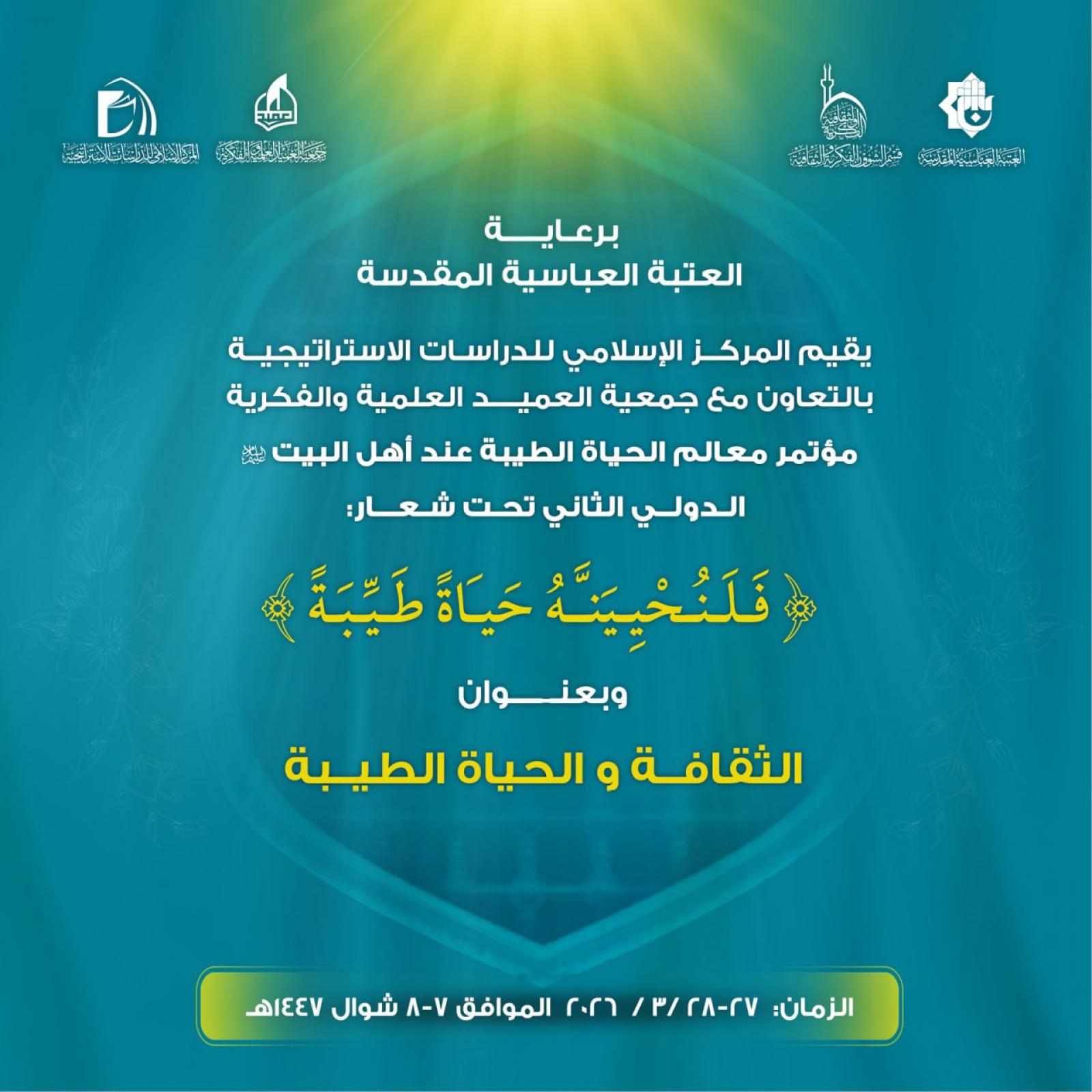 برعاية العتبة العبَّاسيَّة يقيم المركز الإسلامي للدِّراسات الاستراتيجيَّة التَّابع لقسم الشؤون الفكريَّة والثقافيَّة في العتبة العباسيَّة، وبالتعاون مع جمعيَّة العميد العلميَّة والفكريَّة المؤتمر الدَّولي الثاني الذي سيعقد تحت شعار: (فَلَنُحيِيَنَّهُ حَيَاةً طَيِّبَةً) وبعنوان: (الثقافة والحياة الطيِّبة) للمدَّة من 27 - 28 / 3 / 2026 م - الموافق 7-8 شوال1447هـ، ويدعون السَّادة الباحثين والمهتمِّين إلى المشاركة فيه، أمَّا محاوره فهي على النحو الآتي: